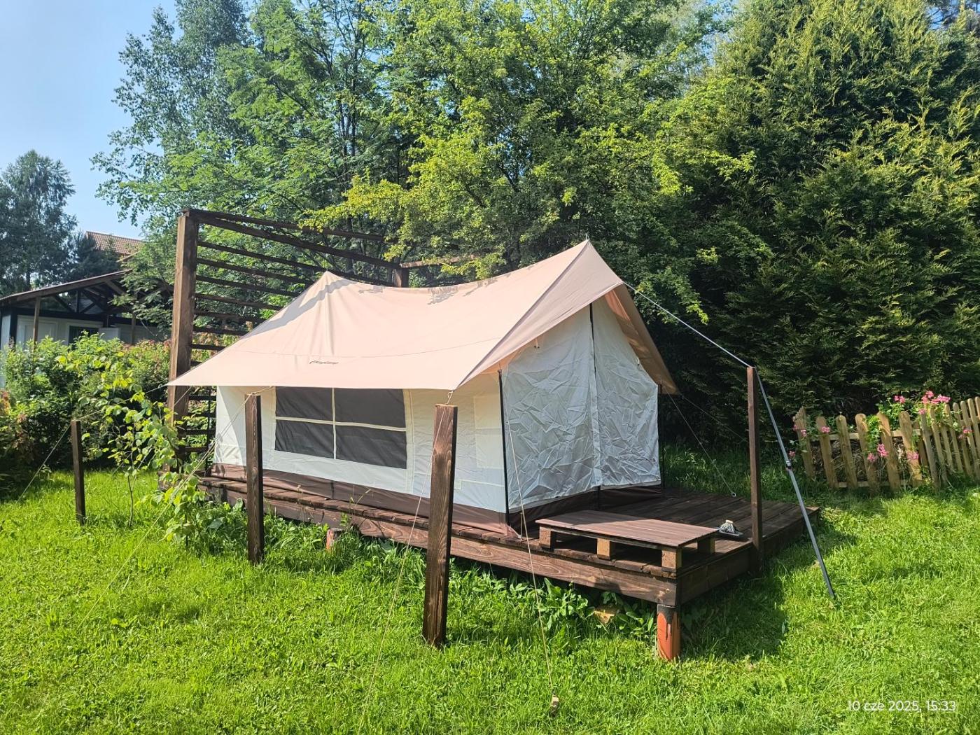 Namiot. Guests will find a stovetop, a refrigerator, kitchenware and a toaster in the kitchen. The tent also provides guests with a barbecue. The tent provides a private entrance, a tea and coffee maker, as well as a shared bathroom featuring a shower and a hairdryer. Namiot - 2 osobowy. Powierzchnia pokoju ok.: 6 mkw.